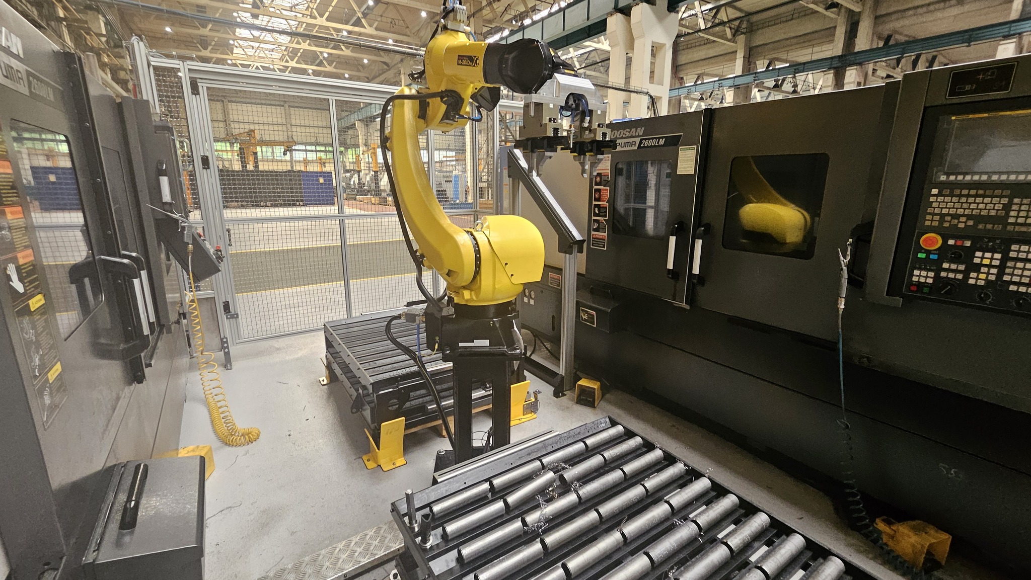 Úkolem tohoto robota-manipulátoru je obsluha 2 CNC soustruhů - vkládá do strojů surové polotovary a vyndává již zpracované díly na další operace.