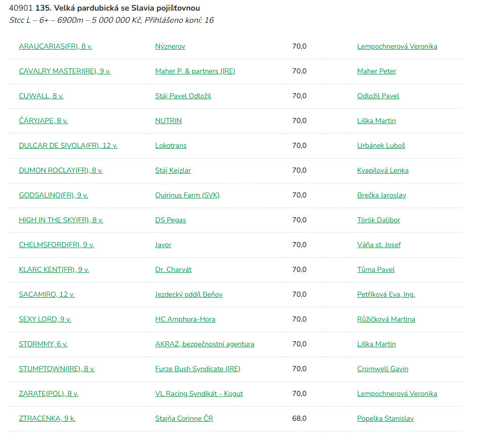 Po uzávěrce přihlášek je jasno – na startu letošní 135. Velké pardubické se Slavia pojišťovnou uvidíme 16 koní. Třináct jich pochází z Česka, jeden ze Slovenska a dva z Irska.