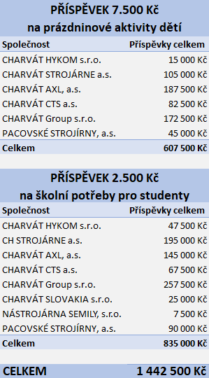 Příspěvek byl určen rodiči dítěte/dětí, který je zaměstnán v hlavním pracovním poměru v některé z firem skupiny CHARVÁT a splňuje jednu z podmínek vyhlášených nadačním fondem: